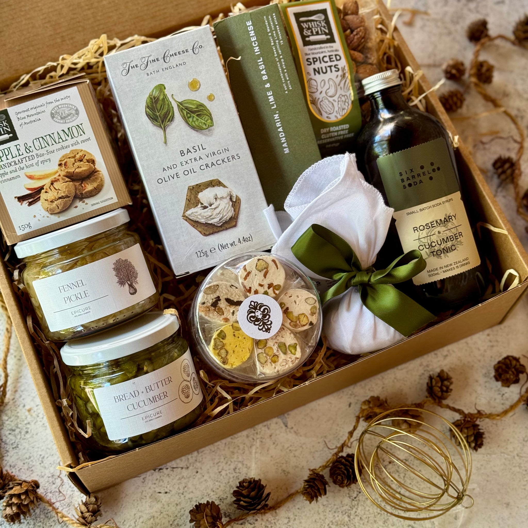 Mix Rosemary & Cucumber Tonic with sparkling water for the perfect poolside drink, or add a splash of gin or tequila after sunset. Fine Cheese Co Basil & Olive Olive Crackers and Whisk & Pin Spiced Nuts will be right at home on a cheese board at happy hour. Bite-size Apple & Cinnamon Biscuits and a mini Christmas pudding make for a couple of sweet treats to tuck into over the holidays. Two of our favourite House Pickles; the Epicure Fennel Pickle and Bread & Butter Cucumber Pickles, are great to have on hand for leftover Christmas ham sandwiches. A little pot of individually wrapped nougat, made with assorted flavours from the garden; saffron, rose, cherry, persimmon and lime, are a little delight to share with guests after lunch. Once the silly season is over, reset in the new year with a calming and balancing incense with a fresh Mandarin, Basil & Lime fragrance - the ultimate aromas of the garden. We love this gift for those who prioritise wellness - full of little luxuries but not too sweet or decadent - but still filled with A grade pantry staples to level up summer lunches as we ring in the new year.