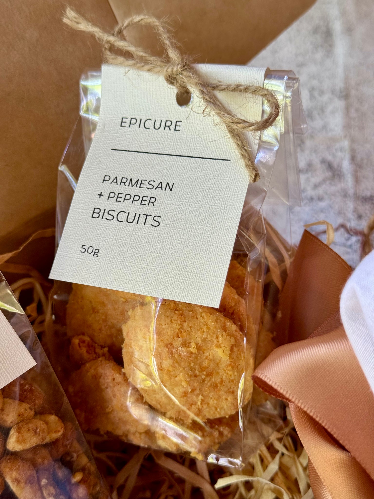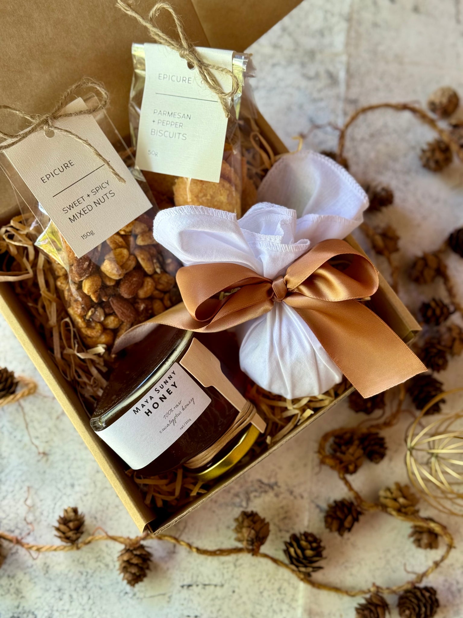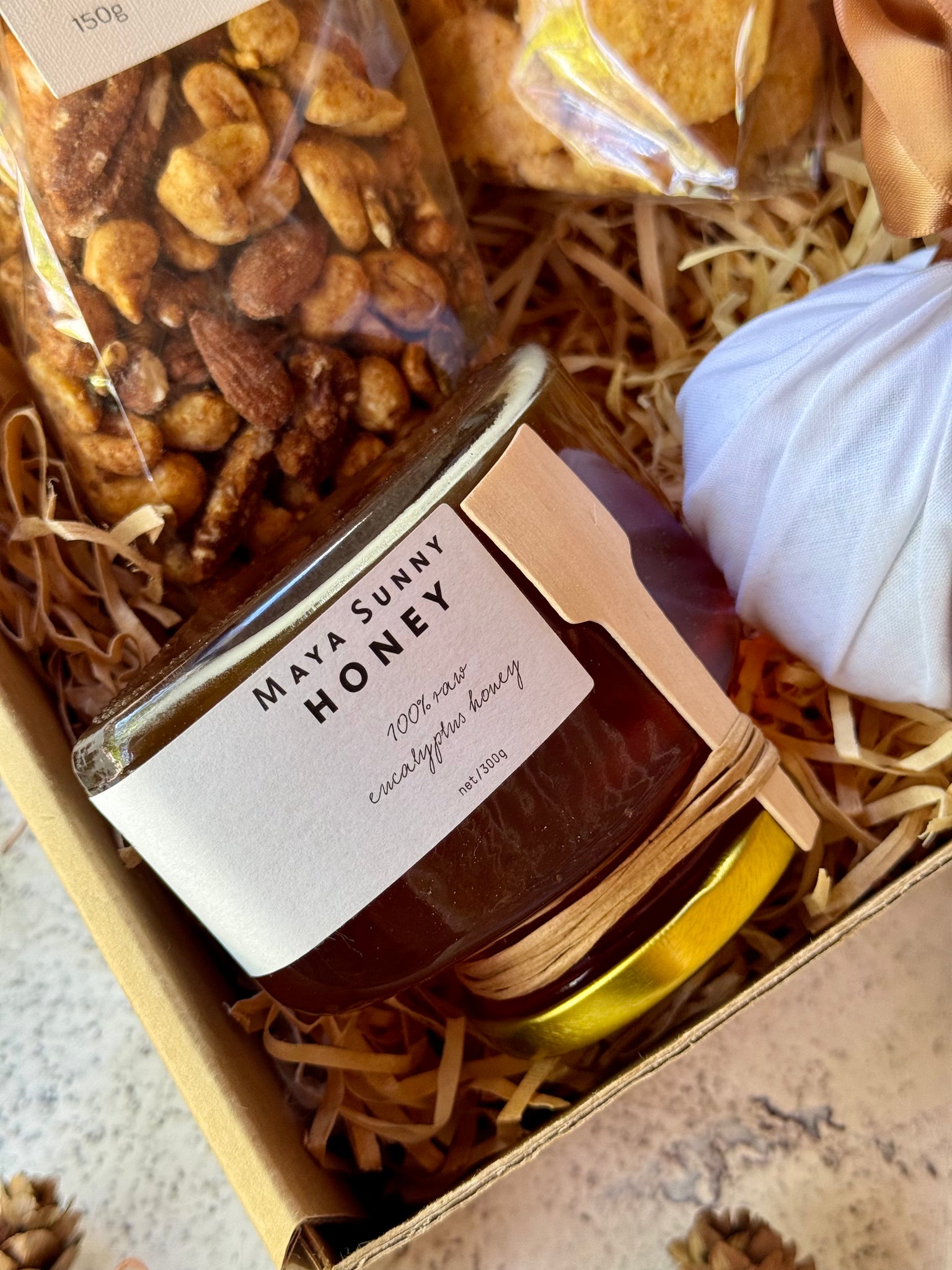 The perfect all-rounder little gesture; our go-to gift for that 'just a little something' Christmas gift. A mini Christmas pudding fills the box with the scents of the season; handmade with high quality Australian vine fruits, real butter and brandy. Our Sweet + Spicy Nuts and moreish Parmesan + Pepper Biscuits are perfect to have on hand for a festive tipple or unexpected visitor. A jar of Maya Sunny Honey lingers in the pantry once the tree is packed away, for Sunday morning crumpets and afternoon cheese plates.