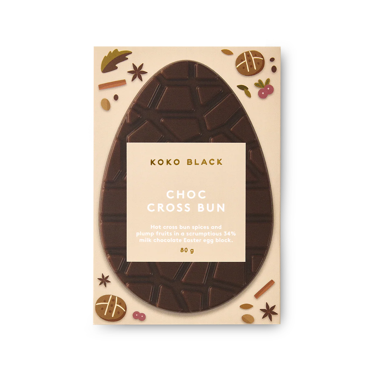 Hot cross bun spices and plump fruits in 34% milk chocolate.