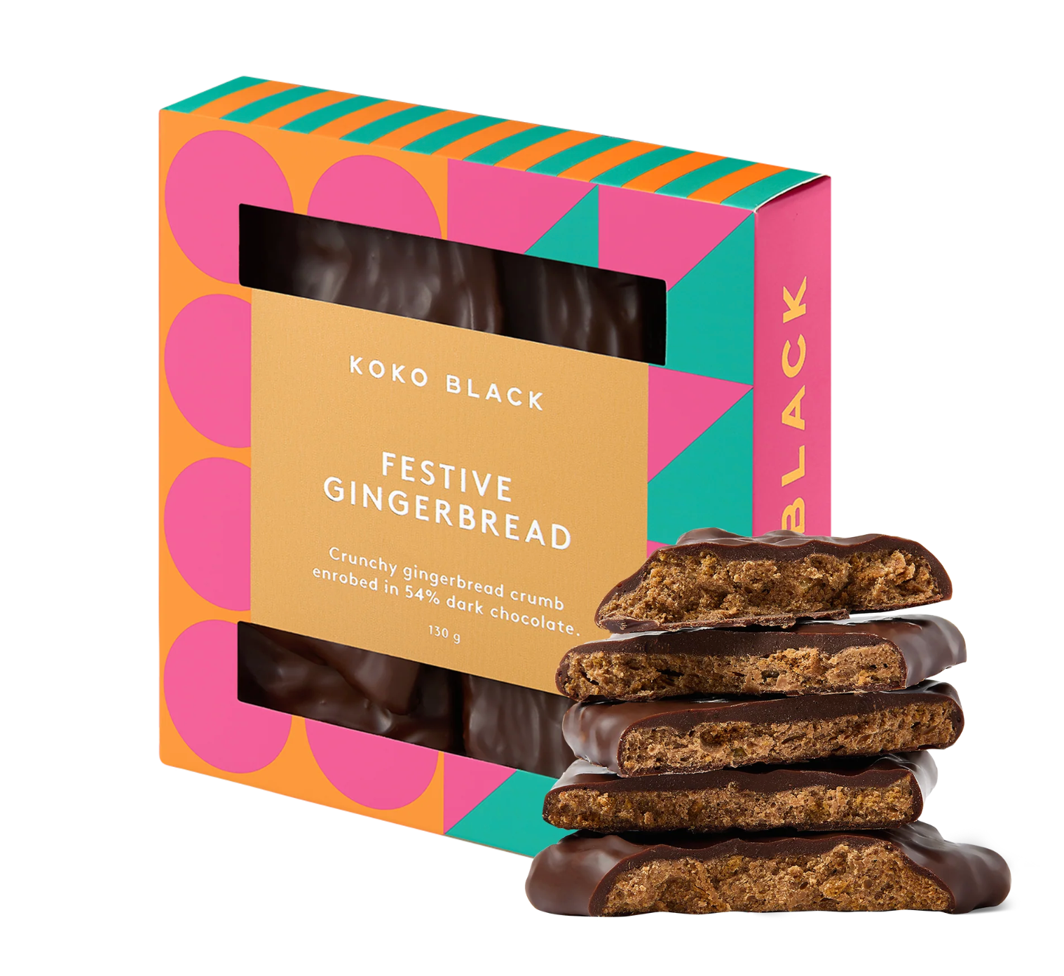 Warmly spiced gingerbread crumb enrobed in 54% dark chocolate.