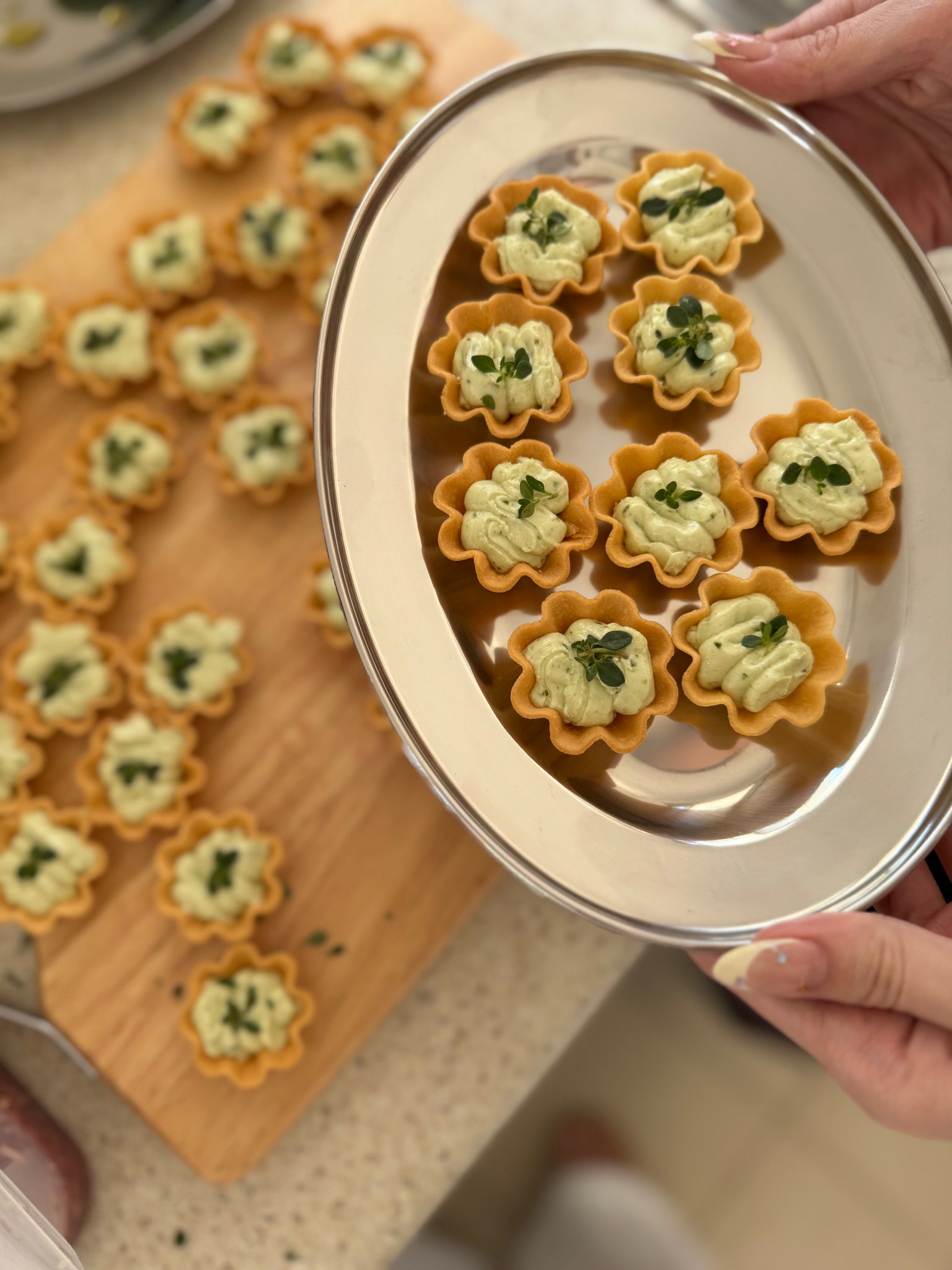 My signature move for every special occasion - Herby Goat Cheese Tiny Tarts - a bite size flavour bomb that makes the perfect arrival snack. Simply assemble by piping the filling into the shells immediately before guests arrive.